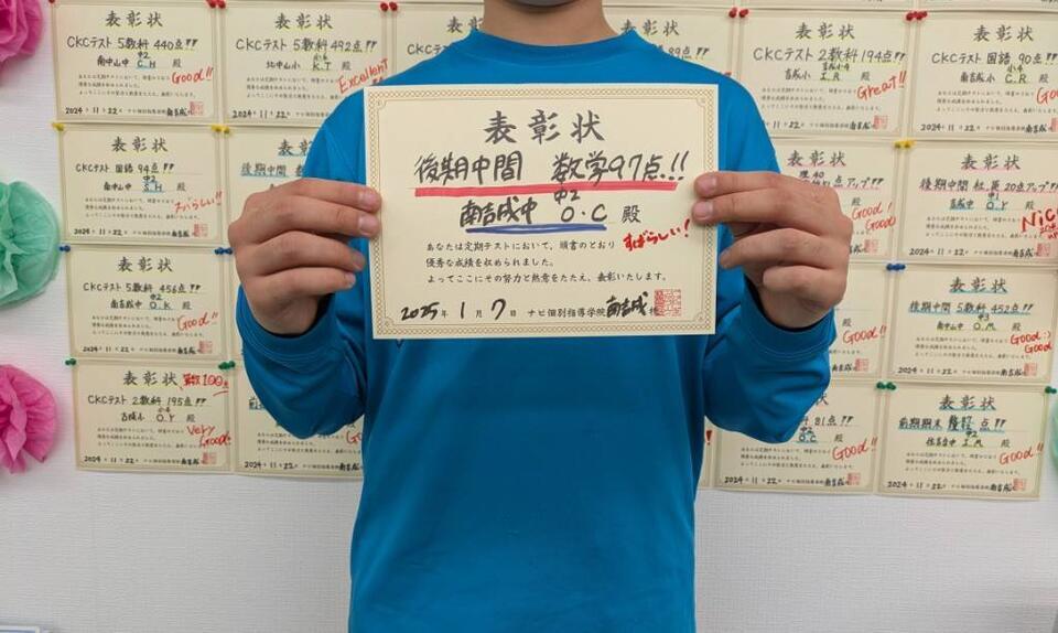 【南吉成中中2 O・Cくん 数学97点(前回から22点アップ!)】