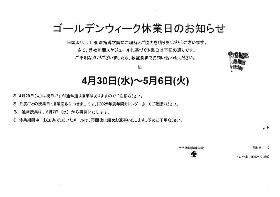 ナビ個別指導学院は、ゴールデンウィークにつき