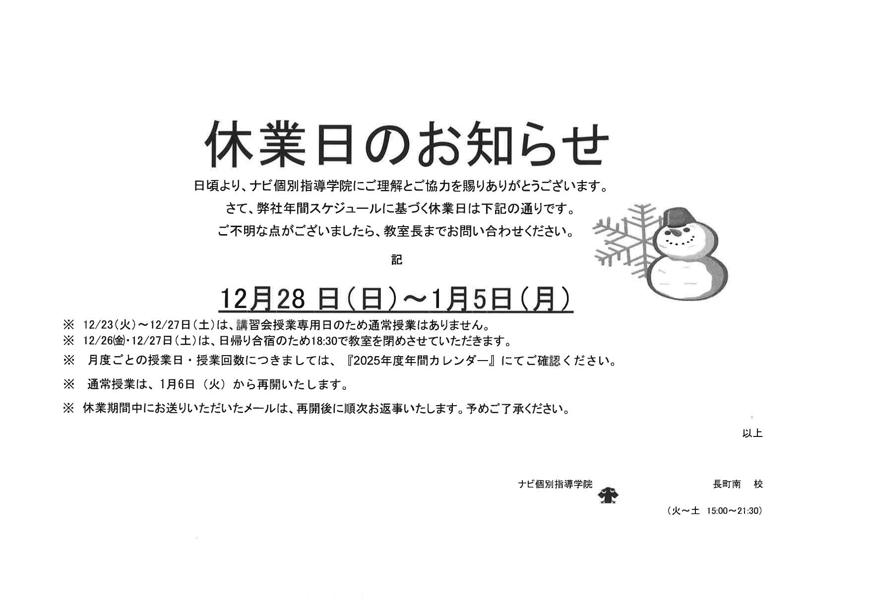 冬期休業日 12月28日(日)~1月5日(月)