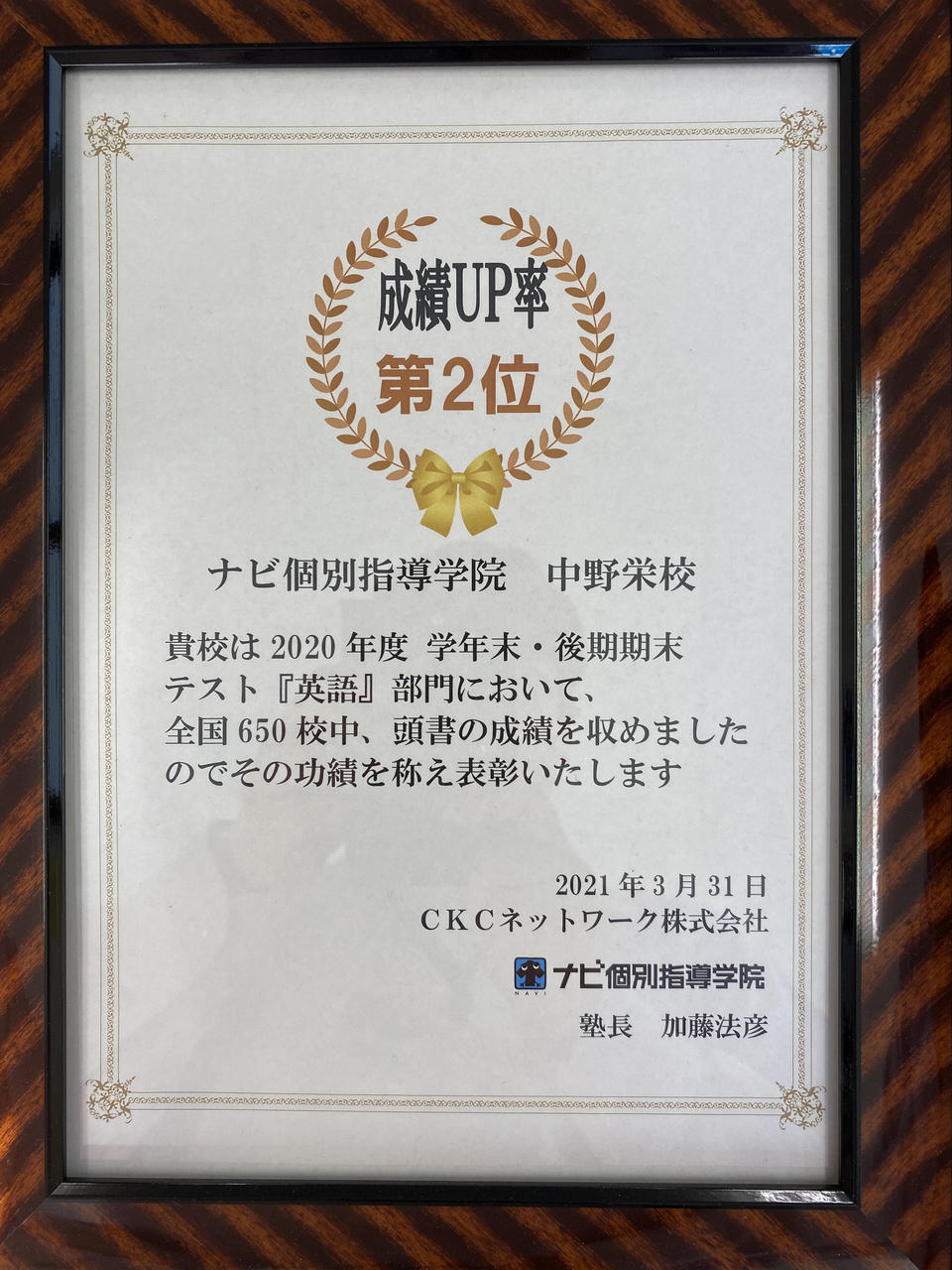 そしてここ中野栄校は英語部門において全650教室中2位、数学部門で12位を獲得しました!