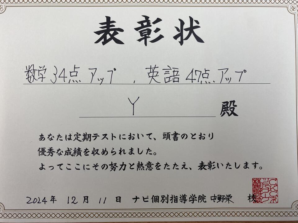 そして今回約半年経過した2学期中間テストで、数学34点、英語47点のアップに成功しました。