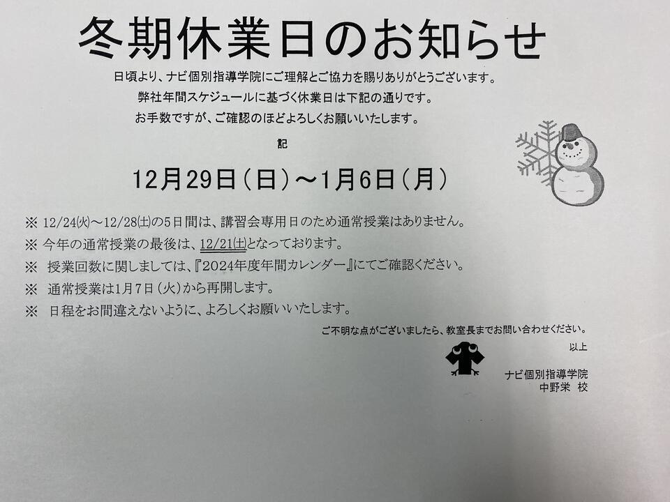 ※12月24日から12月28日は講習会専用日のため通常授業はありません。