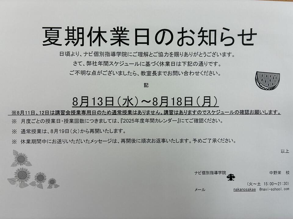 休業後は夏休み終盤、夏休み明けのテストなどに向け全力でバックアップしていきます。