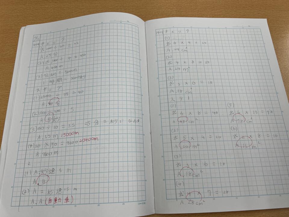 Kくんはノートの使い方もすごくきれいです!どこがチェックの問題で何ページの問題なのか、式も書いてあるからこそ、復習するときにも有効なのが分かりますね!