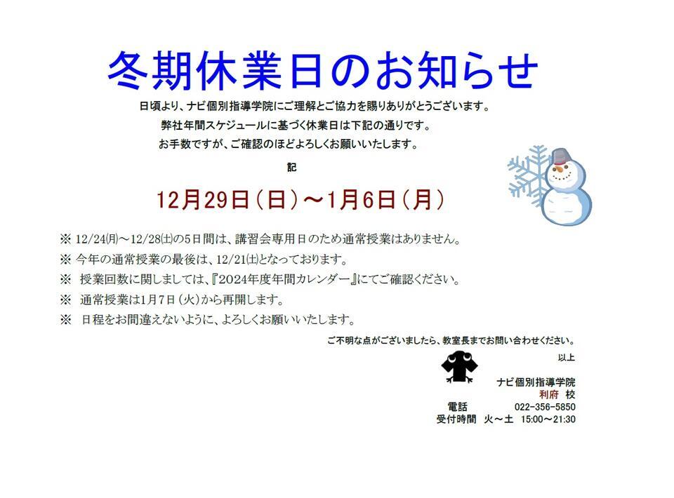 当教室は12/29(日)~1/6(月)まで休校となります。