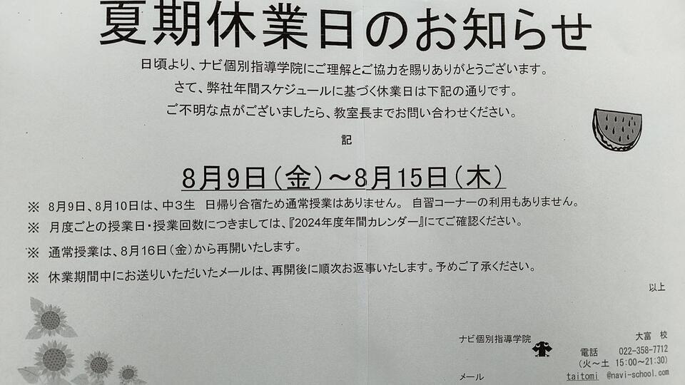 ナビ個別指導学院 大富校は今週金曜日から通常授業はお休みです