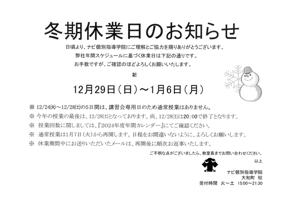 冬期休業日 12月29日(日)~1月6日(月)