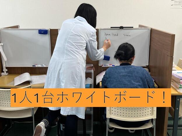 ナビ個別指導学院の授業は、個別の席ごとに設置された自分専用のホワイトボードで解き方や考え方を一緒に確認、それから生徒が問題を解くという「個別授業」スタイルです。