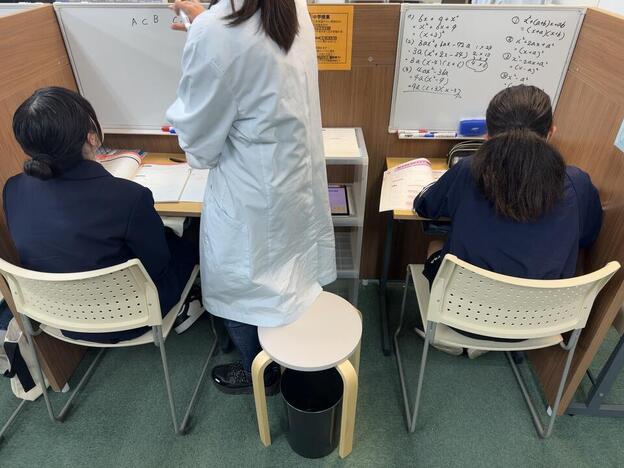 ナビ個別指導学院の授業は、個別の席ごとに設置された自分専用のホワイトボードで解き方や考え方を一緒に確認、それから生徒が問題を解くという「個別授業」スタイルです。