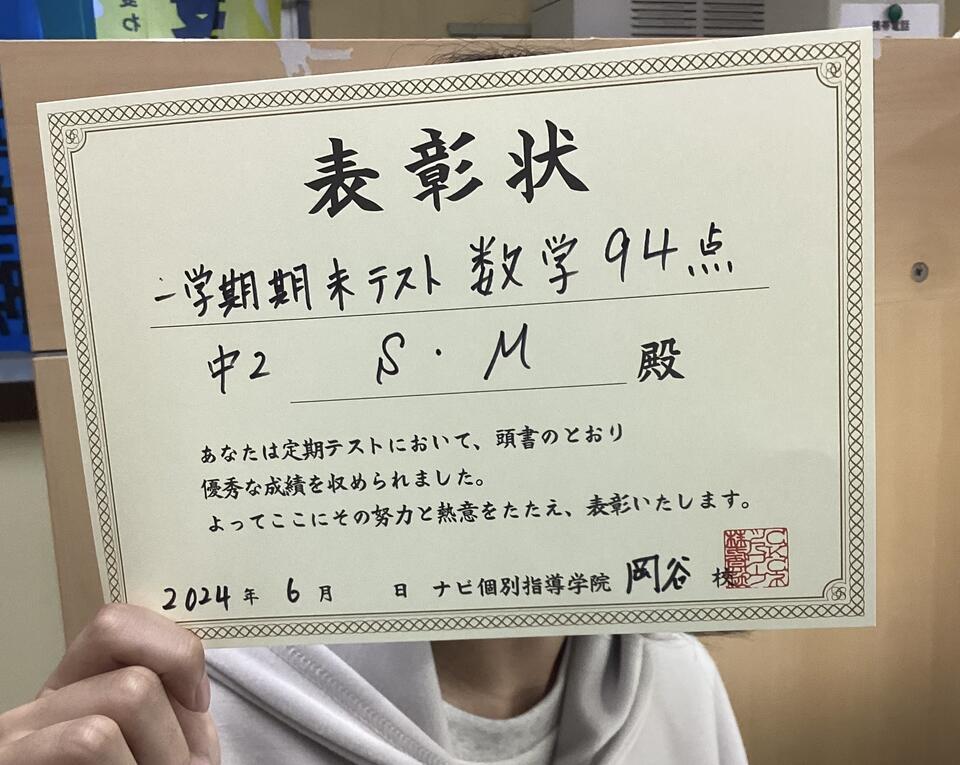 本日は、一学期期末テストで、数学を94点を獲得した、S.Mちゃんを紹介いたします!