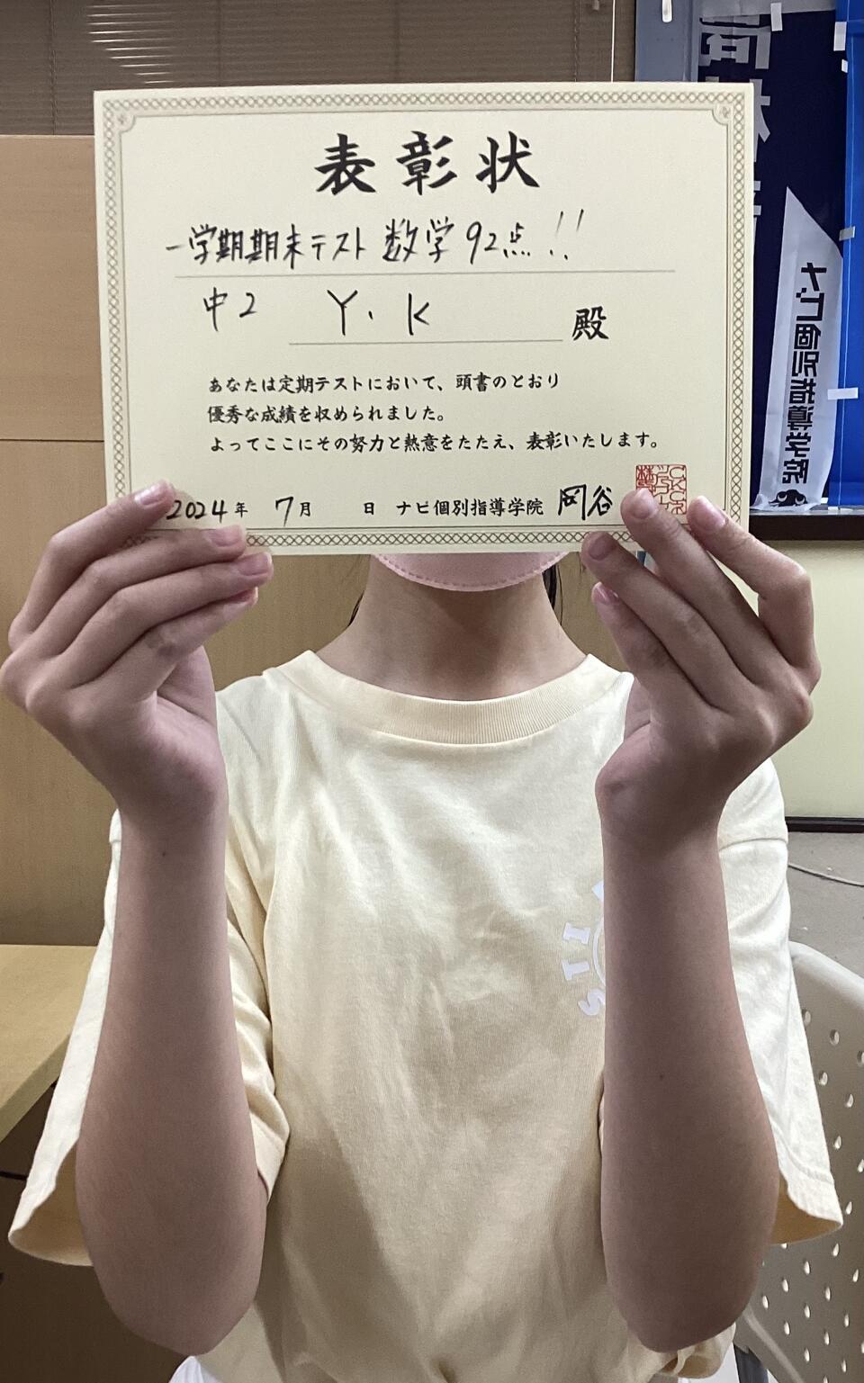本日は、一学期期末テストで、数学を92点を獲得した、Y・Kちゃんを紹介いたします!