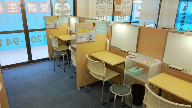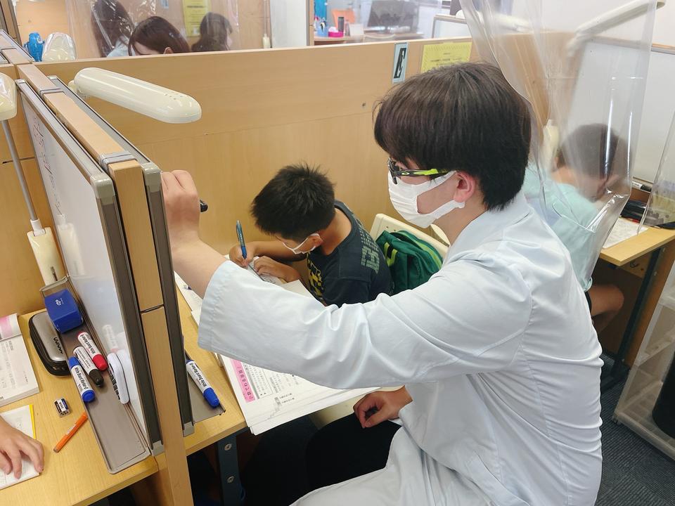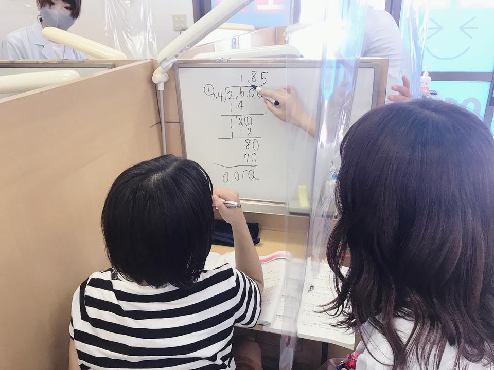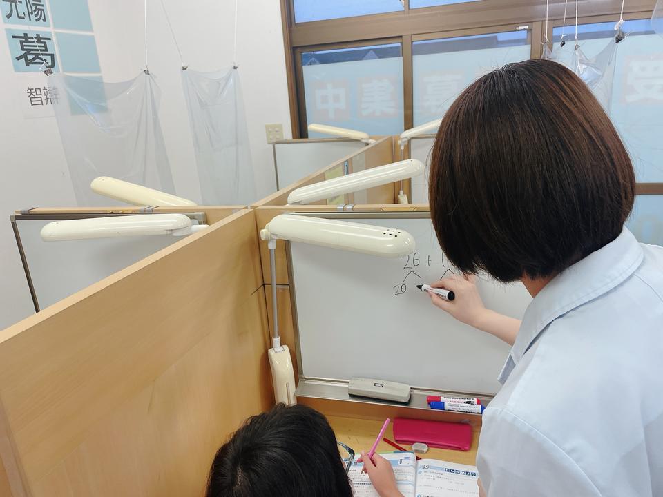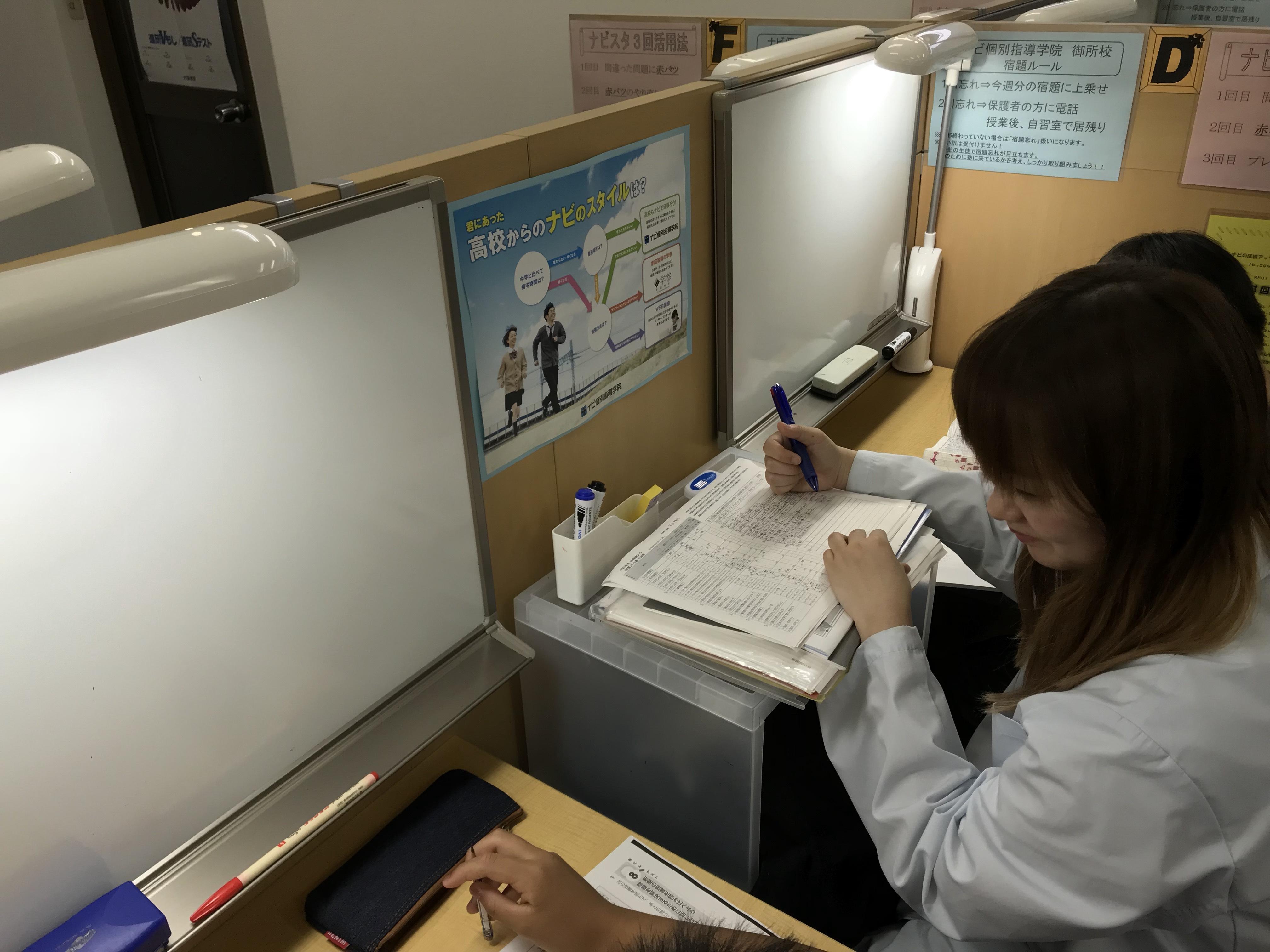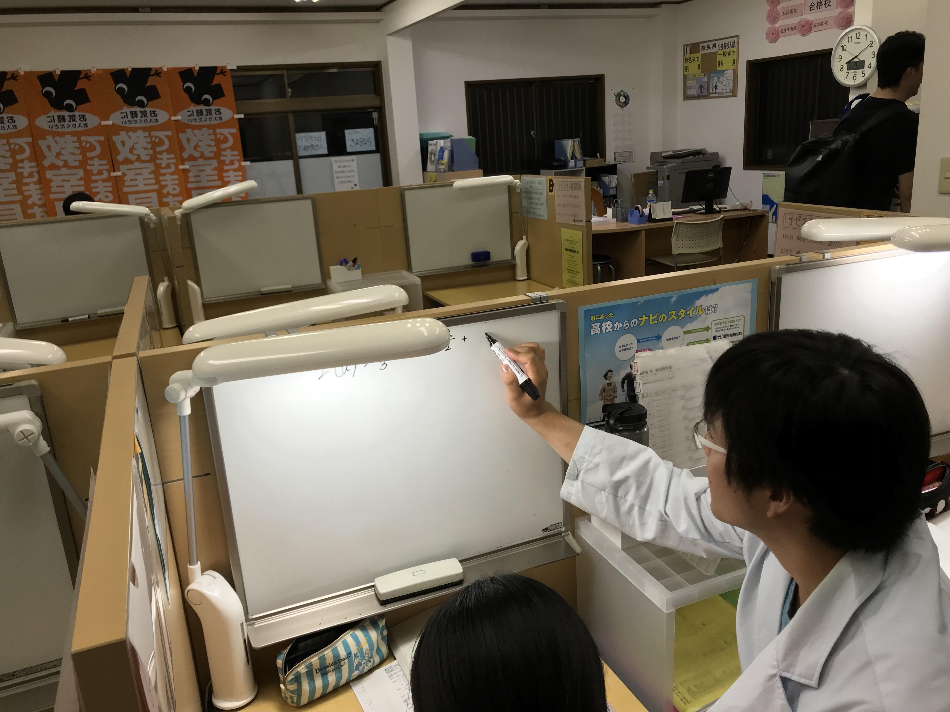 ナビ個別指導学院の授業は、個別の席ごとに設置された自分専用のホワイトボードで解き方や考え方を一緒に確認、それから生徒が問題を解くという「個別授業」スタイルです。
