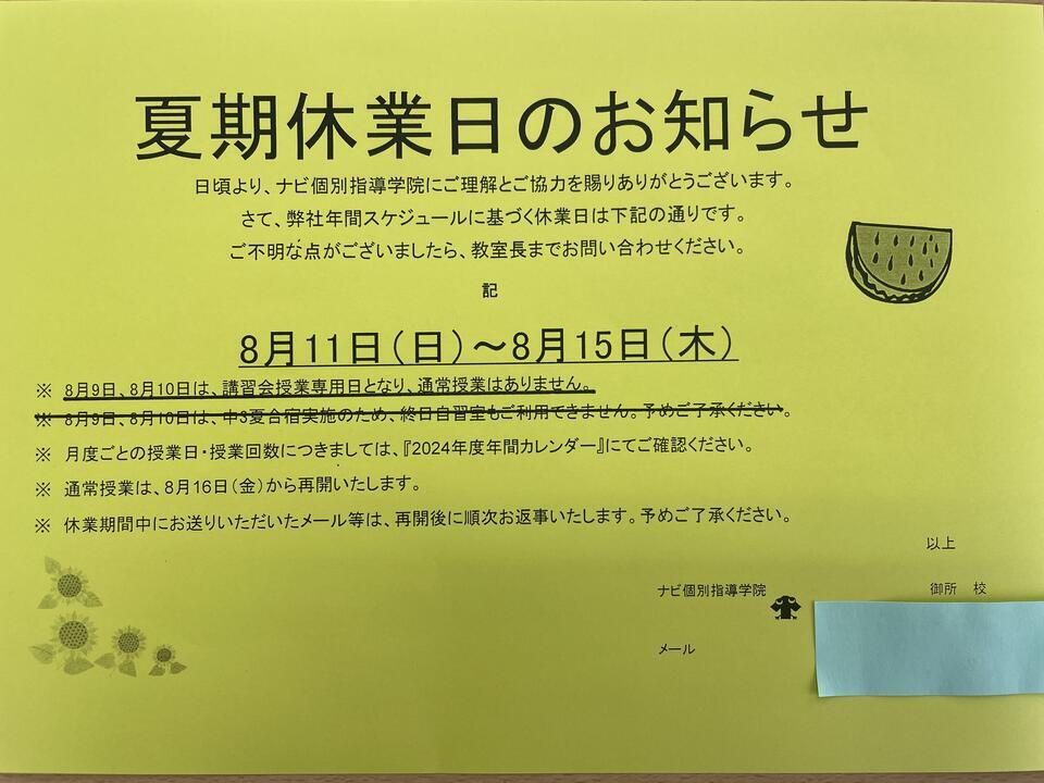 8月11日(日)~8月15日(木)こちらの期間が夏期休業となります。