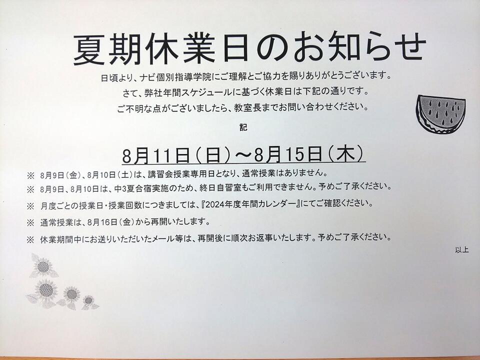 8月11日(日)~8月15日(木)は、夏期休業日です。