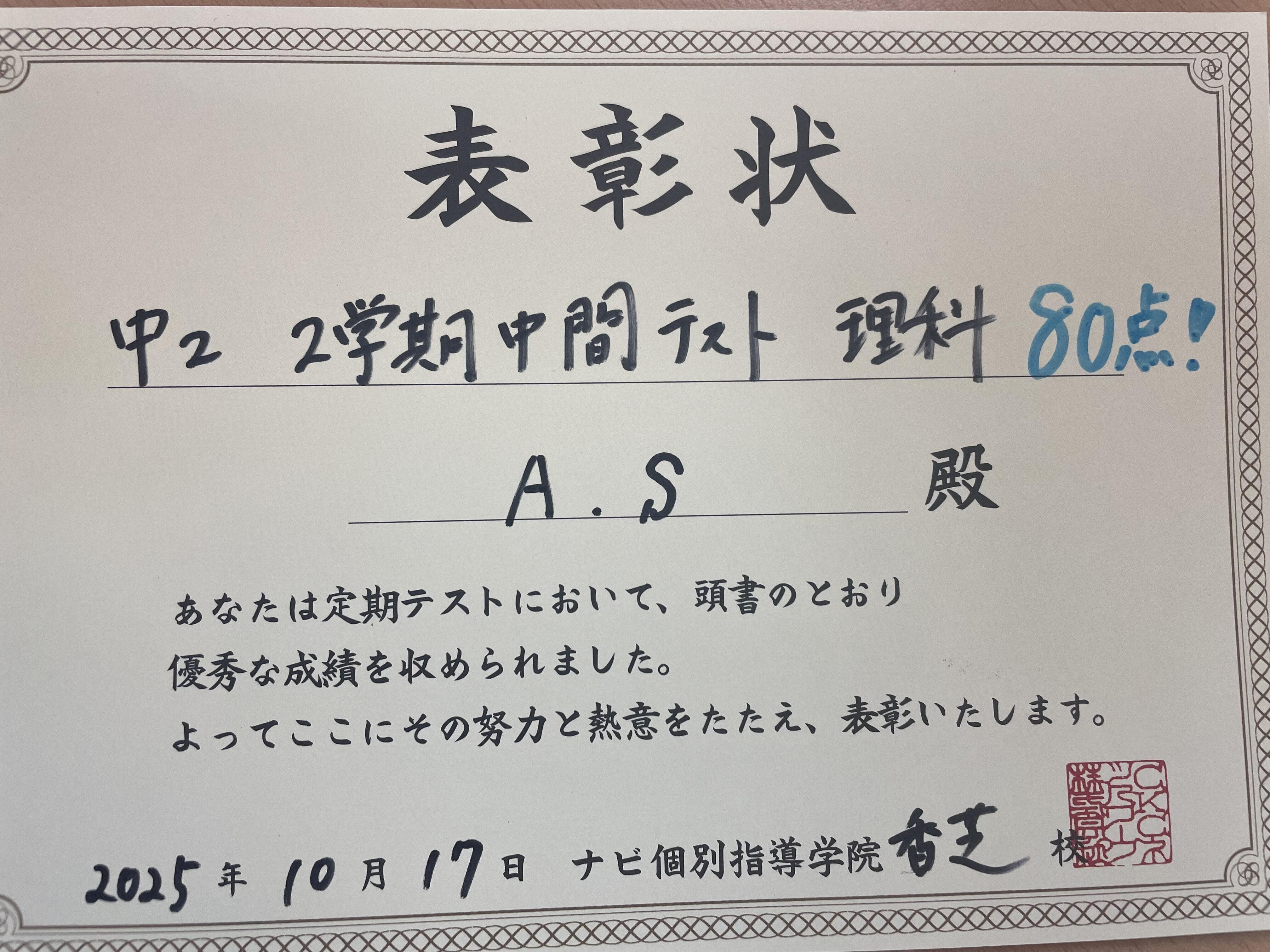 中間テストのうれしい結果が次々と返ってきてますので