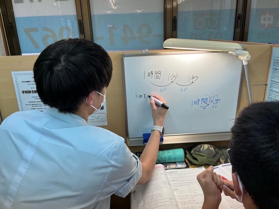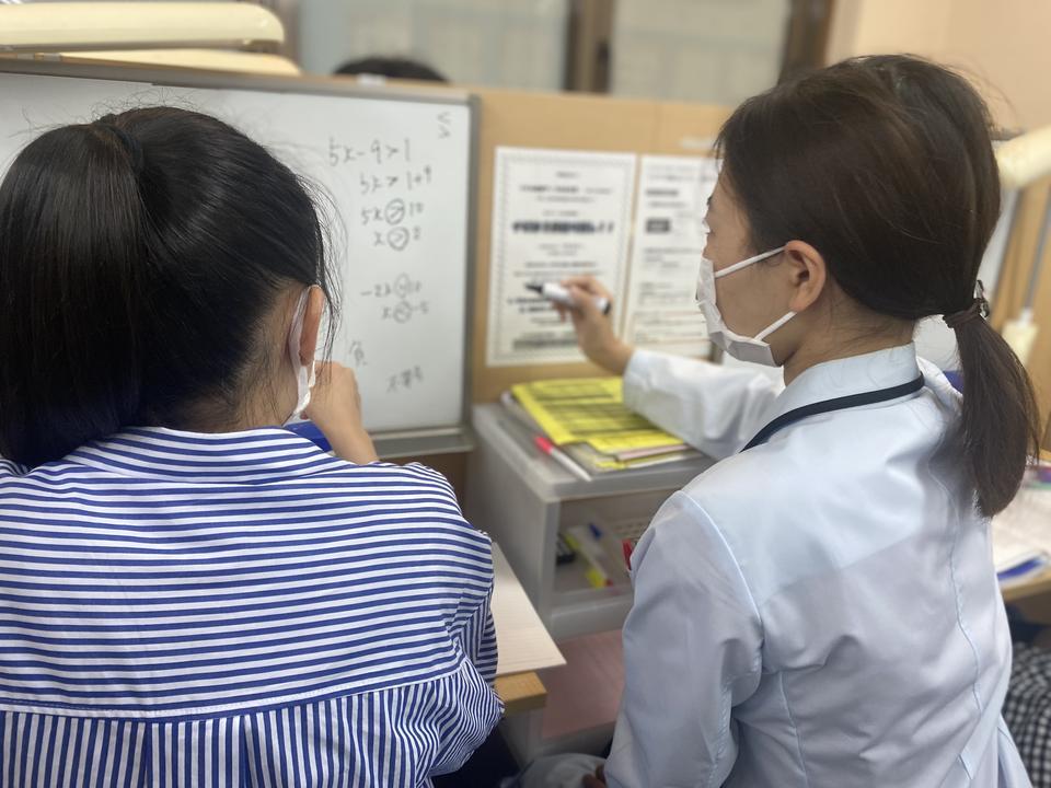 ナビ個別指導学院の授業は、個別の席ごとに設置された自分専用のホワイトボードで解き方や考え方を一緒に確認、それから生徒が問題を解くという「個別授業」スタイルです。