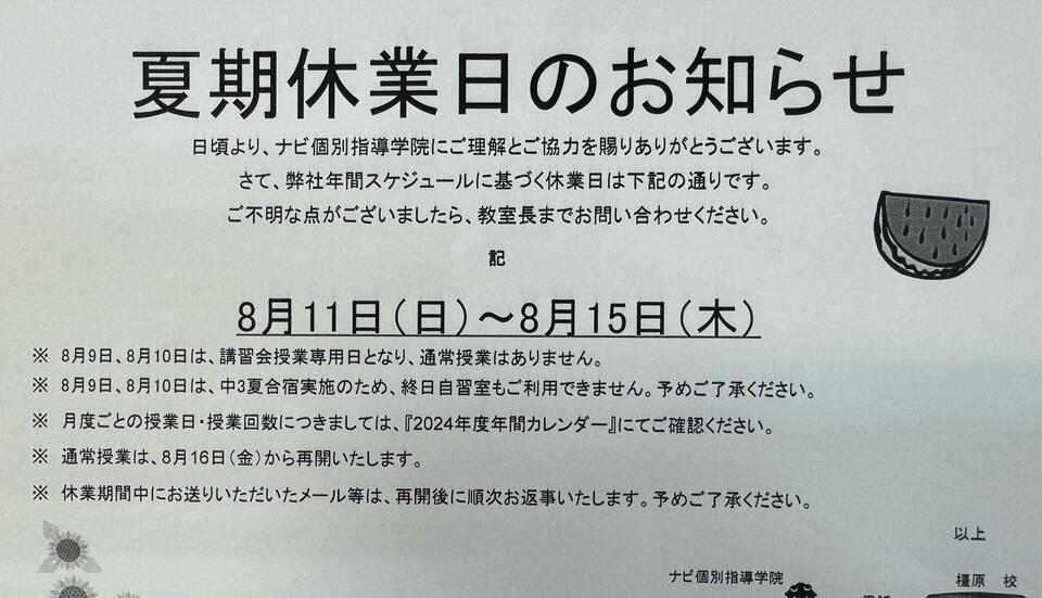 お盆休み明け、元気でお会いできるのを楽しみにしております!
