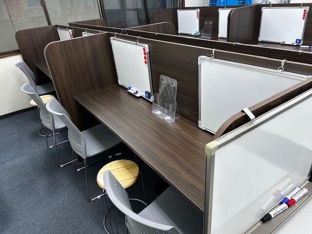 ナビ個別指導学院の授業は、個別の席ごとに設置された自分専用のホワイトボードで解き方や考え方を一緒に確認、それから生徒が問題を解くという「個別授業」スタイルです。
