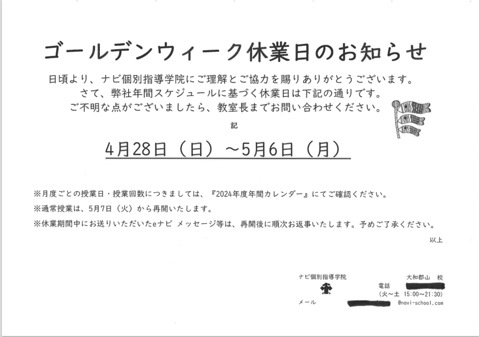 ナビ大和郡山校では、GWに伴いGW休業を頂きます。