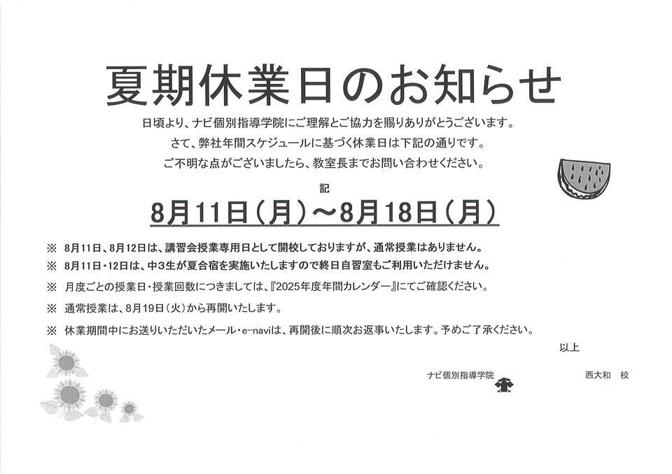 ご不明な点等ございましたら、教室長までお問い合わせください。