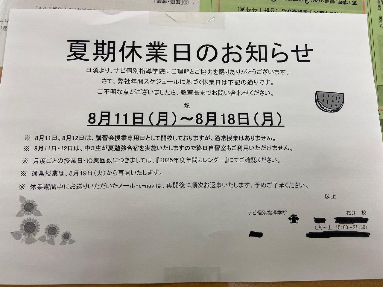 お盆休み明けから2学期へ向けて勉強スタートしてまいりますので、