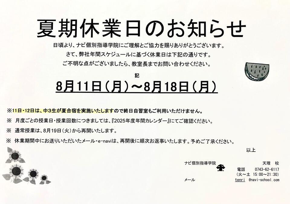 ナビ天理校は8月11日(月)~8月18日(月)まで夏期休業となっております。塾の自習室利用や体験等もできなくなりますので、お気を付けください。お盆休み明けから2学期へ向けて勉強スタートしてまいりますので、よろしくお願いいたします。