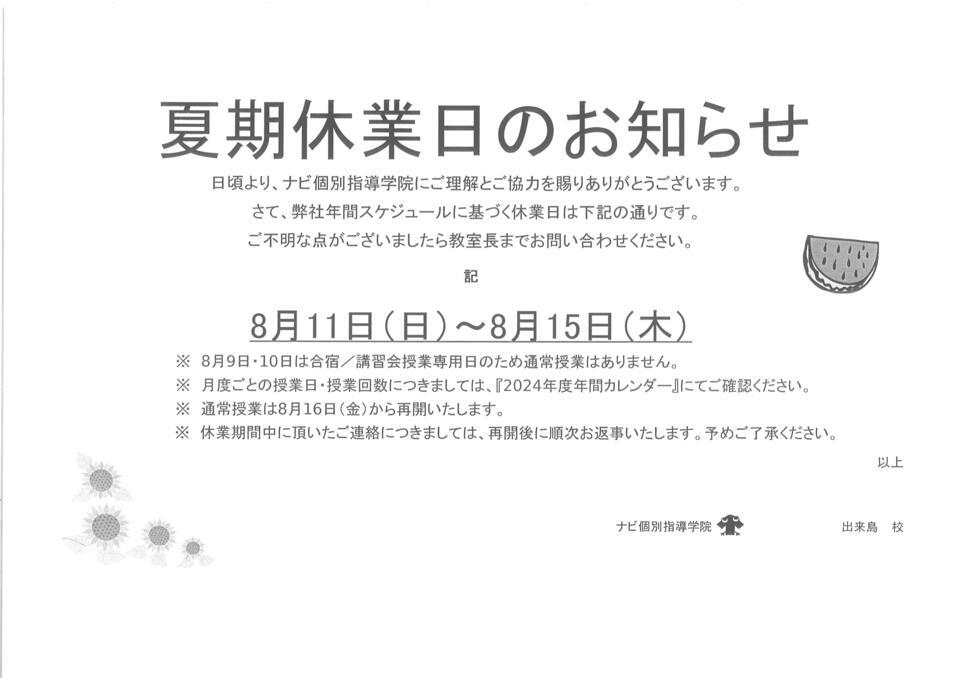 日頃より、ナビ個別指導学院にご理解とご協力を賜りありがとうございます。さて、弊社年間スケジュールに基づく休業日は下記の通りです。