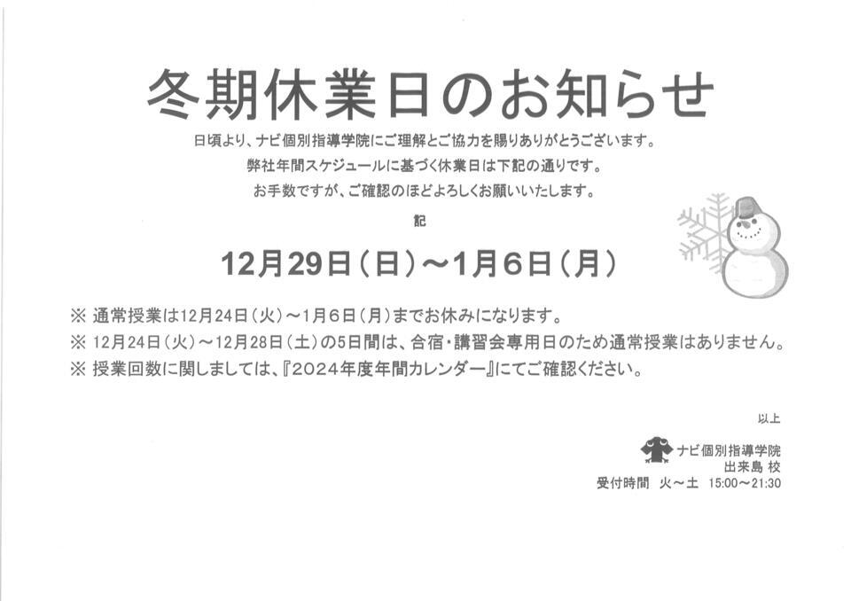 ※12月24日(火)~28日(土)は講習会専用日のため通常授業はございません。(自習室はご利用いただけます。)