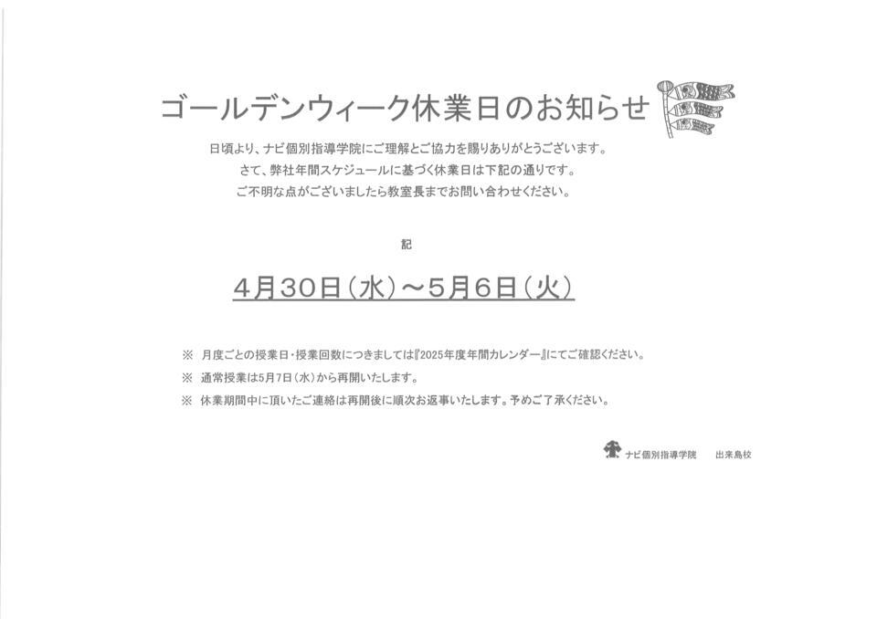 日頃より、ナビ個別指導学院にご理解とご協力を賜りありがとうございます。弊社年間スケジュールに基づくゴールデンウィーク休業日は下記の通りです。【 ゴールデンウィーク休業日 】4月30日(水)~5月6日(火)※月度ごとの授業日・授業回数につきましては『2025年度年間カレンダー』にてご確認ください。※5月7日(水)より通常授業を再開いたします。※休業期間中に頂いたご連絡につきましては再開後に順次お返事いたします。