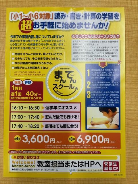 今、 小学1年生から小学6年生対象にまんてんスクールのコースがあります。