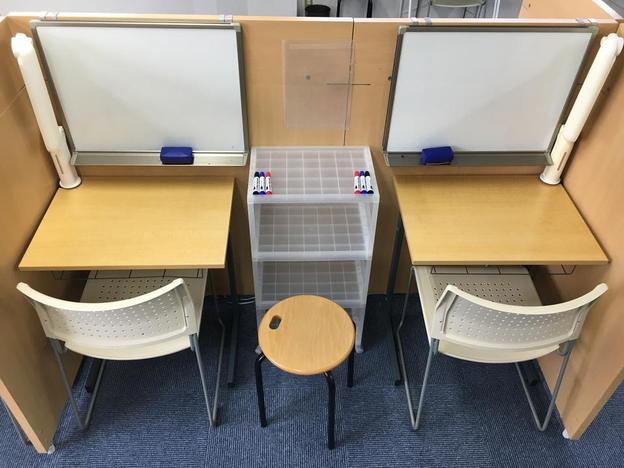 ナビ個別指導学院の授業は、個別の席ごとに設置された自分専用のホワイトボードで解き方や考え方を一緒に確認、それから生徒が問題を解くという「個別授業」スタイルです。