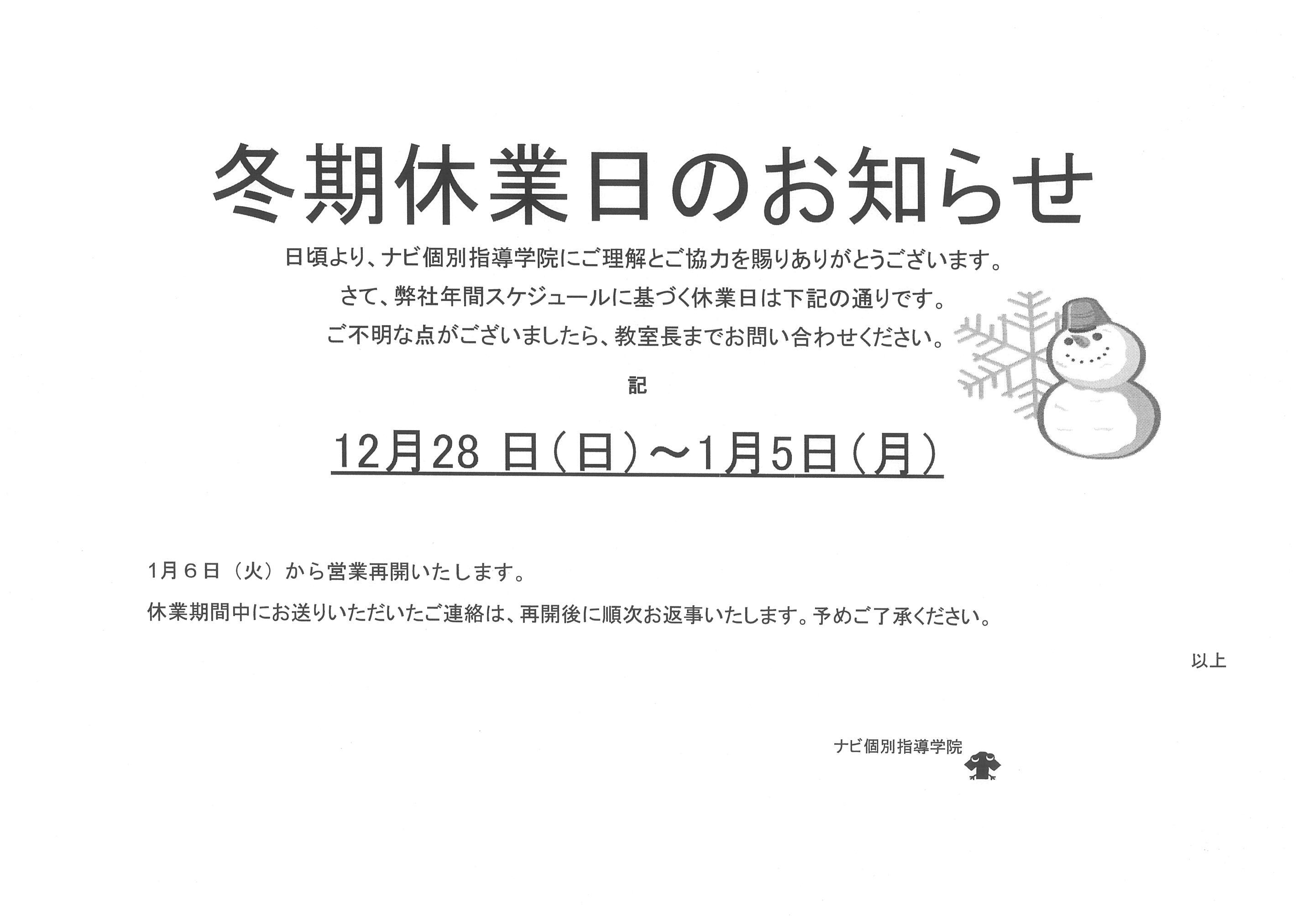 冬期休業 12月28日(日)~1月5日(月)