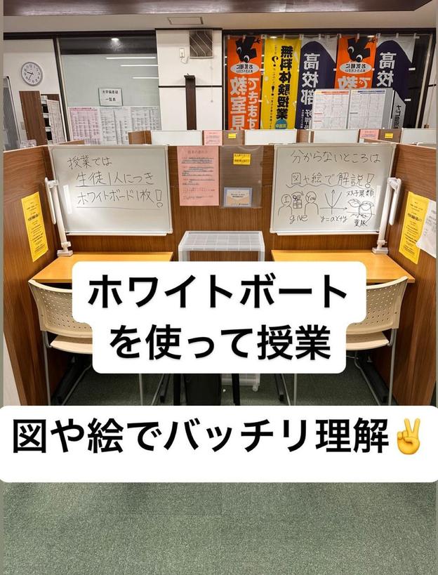 ナビ個別指導学院の授業は、個別の席ごとに設置された自分専用のホワイトボードで解き方や考え方を一緒に確認、それから生徒が問題を解くという「個別授業」スタイルです。
