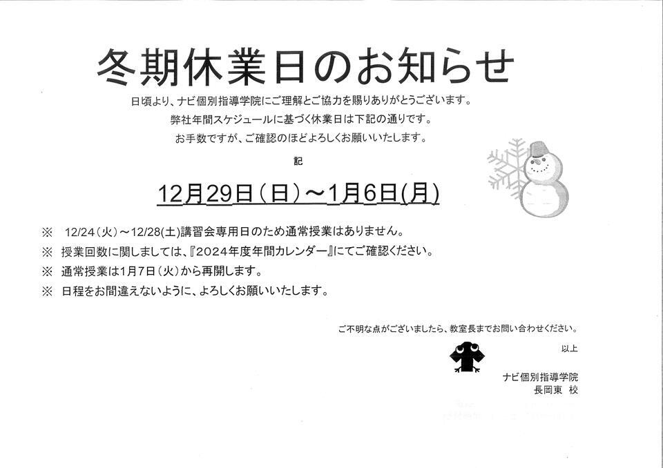 長岡市で塾をお探しの皆さんこんにちは!ナビ個別指導学院長岡東校です。日頃より、ナビ個別指導学院にご理解とご協力を賜りありがとうございます。さて、弊社年間スケジュールに基づく休業日は下記の通りです。ご不明な点がございましたら、教室長までお問い合わせください。冬期休業日 12月29日(日)~ 1月6日(月)※休業期間中にお送りいただいたメールは、再開後に順次お返事いたします。 予めご了承ください。