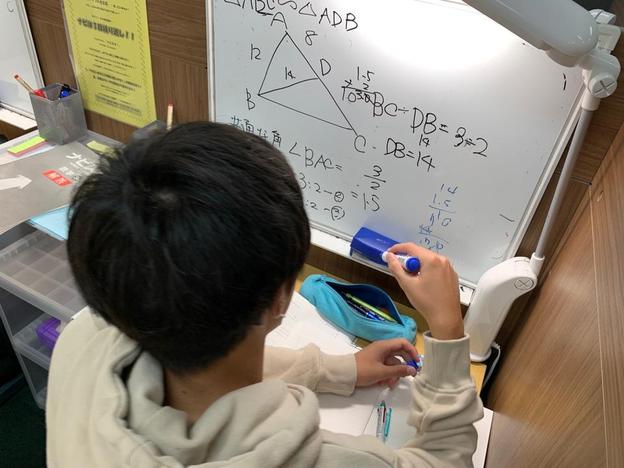 ナビ個別指導学院の授業は、個別の席ごとに設置された自分専用のホワイトボードで解き方や考え方を一緒に確認、それから生徒が問題を解くという「個別授業」スタイルです。