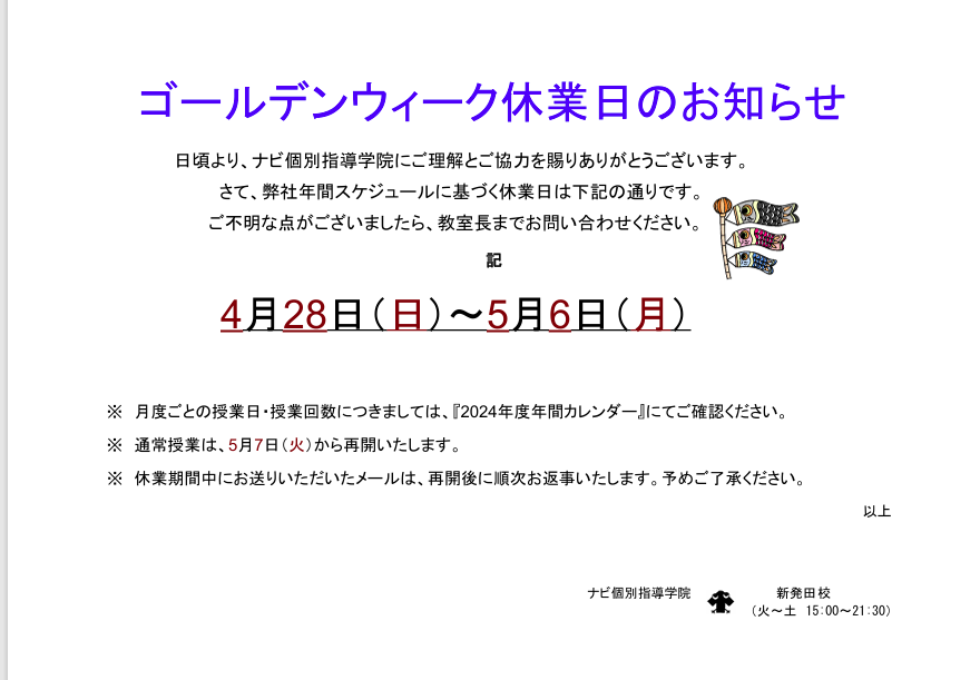 日ごろより、ナビ個別指導学院にご理解とご協力を賜りありがとうございます。