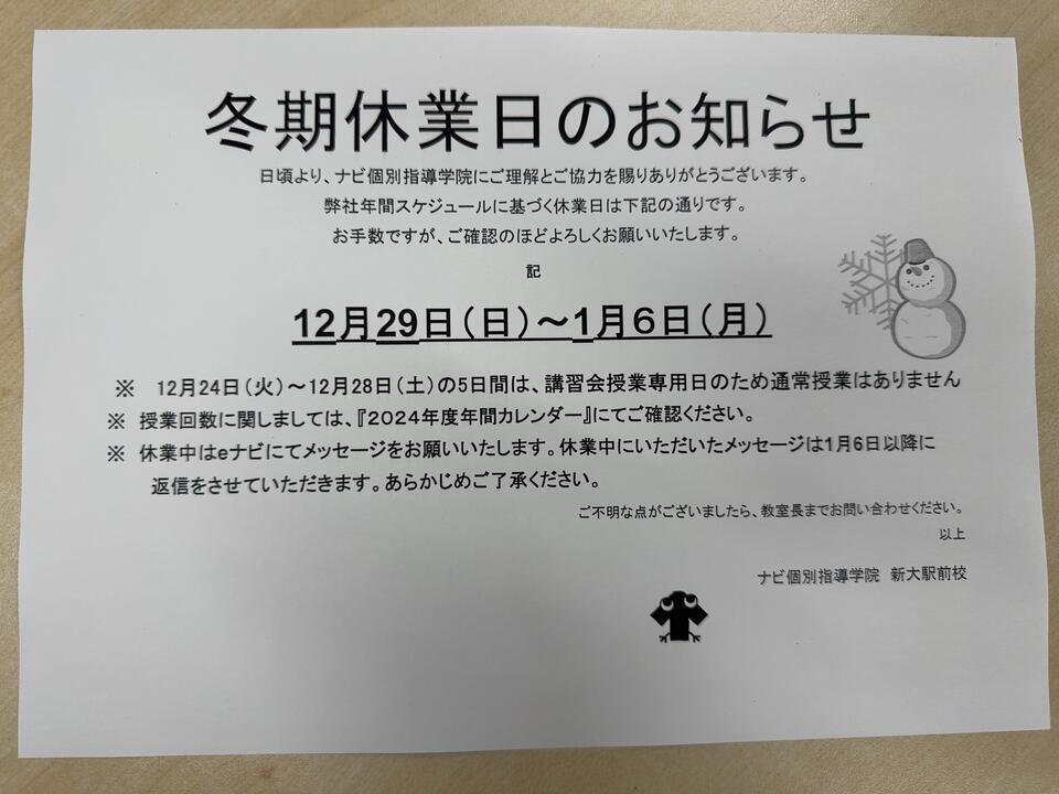 日頃より、ナビ個別指導学院にご理解とご協力を賜りありがとうございます。さて、弊社年間スケジュールに基づく休業日は下記の通りです。ご不明な点がございましたら、教室長までお問い合わせください。冬期休業日 12月29日(日)~ 1月6日(月)※休業期間中にお送りいただいたメールは、再開後に順次お返事いたします。 予めご了承ください。