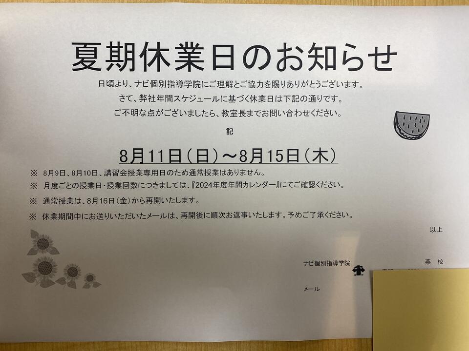 夏期休業日 8月9日(金)~ 8月15日(木)