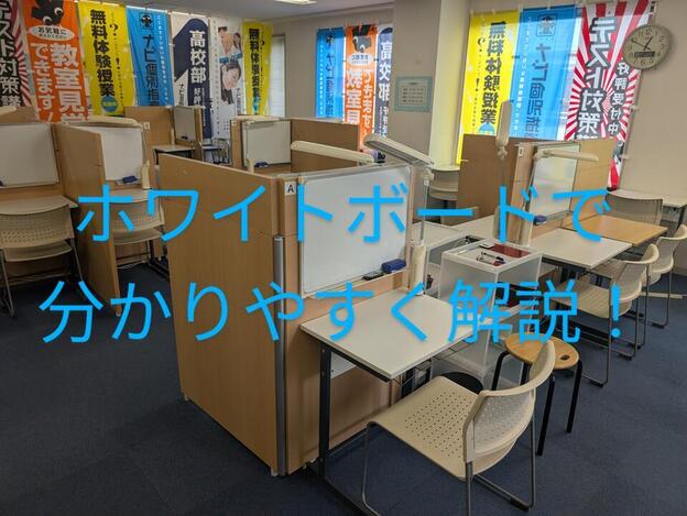 ナビ個別指導学院の授業は、個別の席ごとに設置された自分専用のホワイトボードで解き方や考え方を一緒に確認、それから生徒が問題を解くという「個別授業」スタイルです。