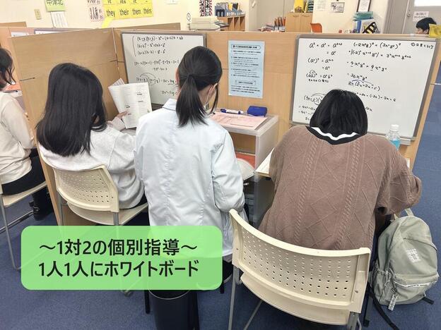 ナビ個別指導学院の授業は、個別の席ごとに設置された自分専用のホワイトボードで解き方や考え方を一緒に確認、それから生徒が問題を解くという「個別授業」スタイルです。