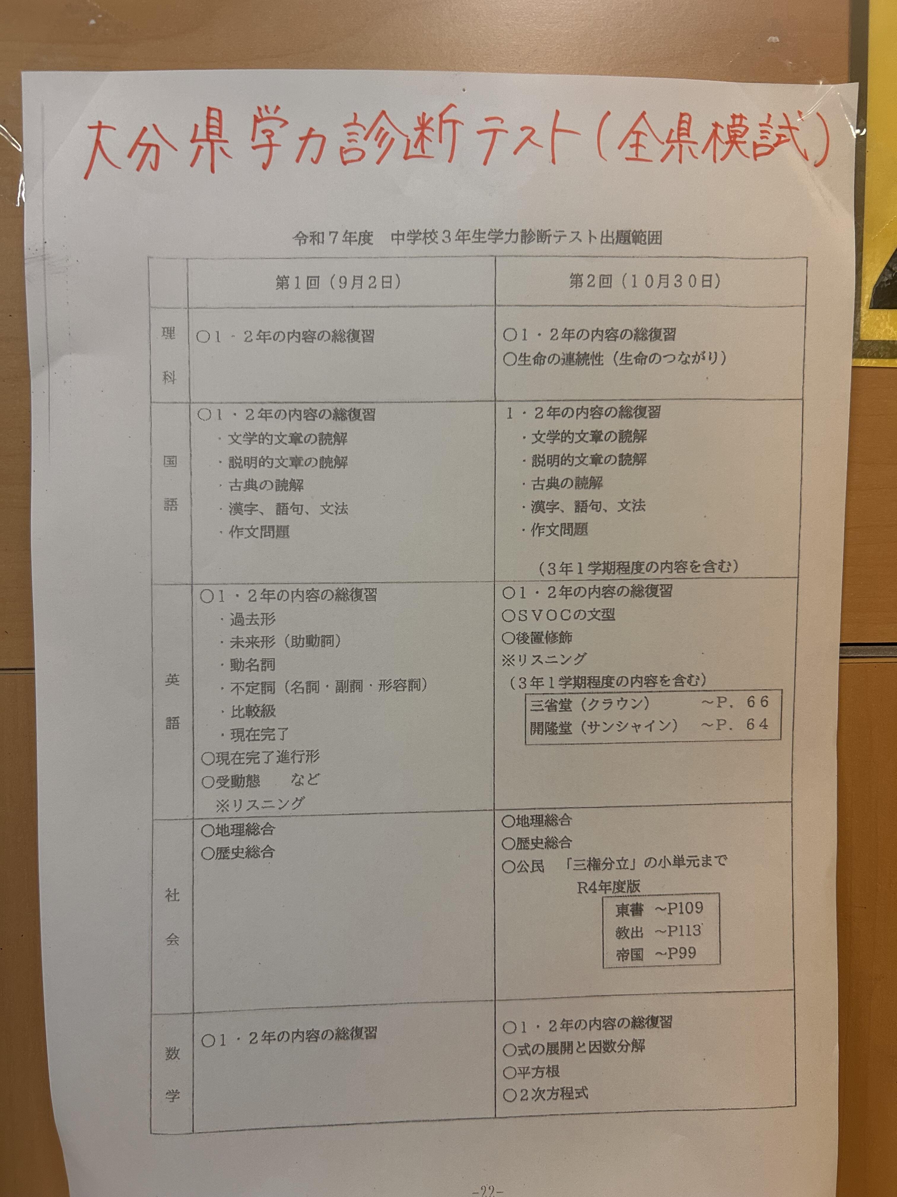大分県の中学校では、9月2日(火)に第1回大分県実力テストが実施されました。