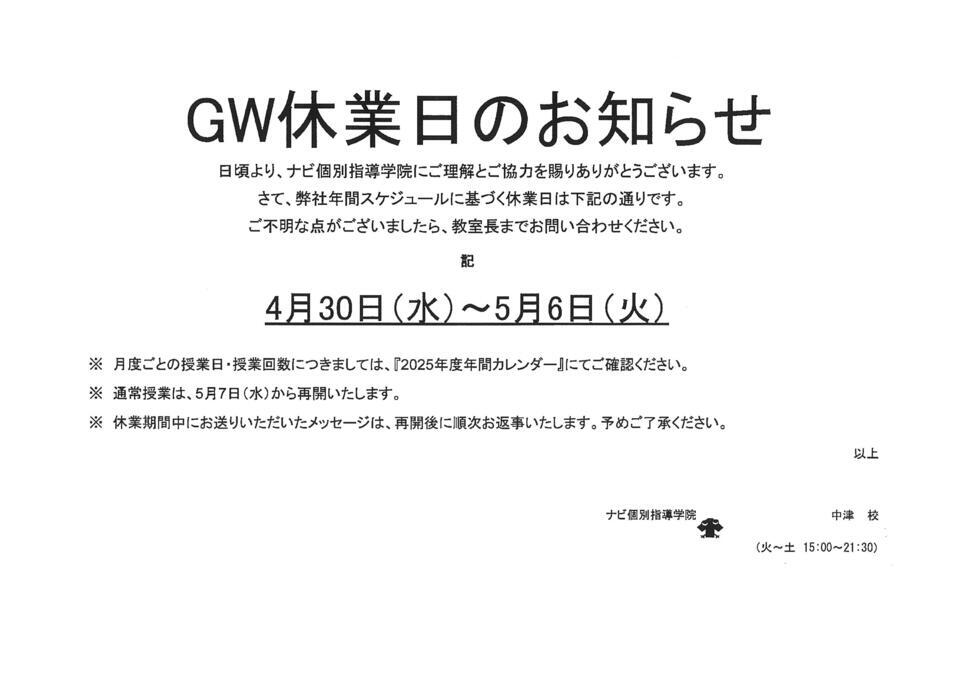 中津市牛神町にある個別塾、ナビ個別指導学院です。画像にもあるように、ゴールデンウイーク休業として4/30(水)~5/6(火)の期間、おやすみをいただきます。体験授業に関しても、休業期間は受講できませんので、予めご了承ください‼よきGWをお過ごしくださいね!