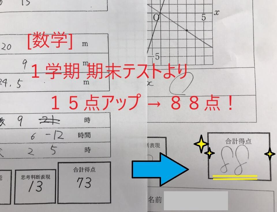 1学期 期末テストより15点アップ → 88点!