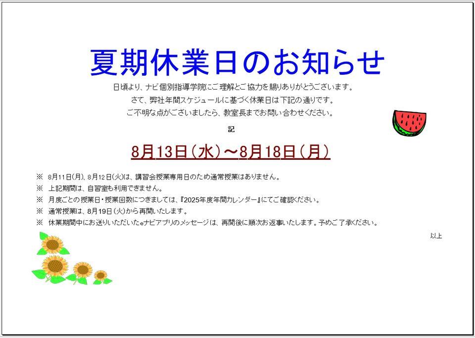 夏期休業日のお知らせです。