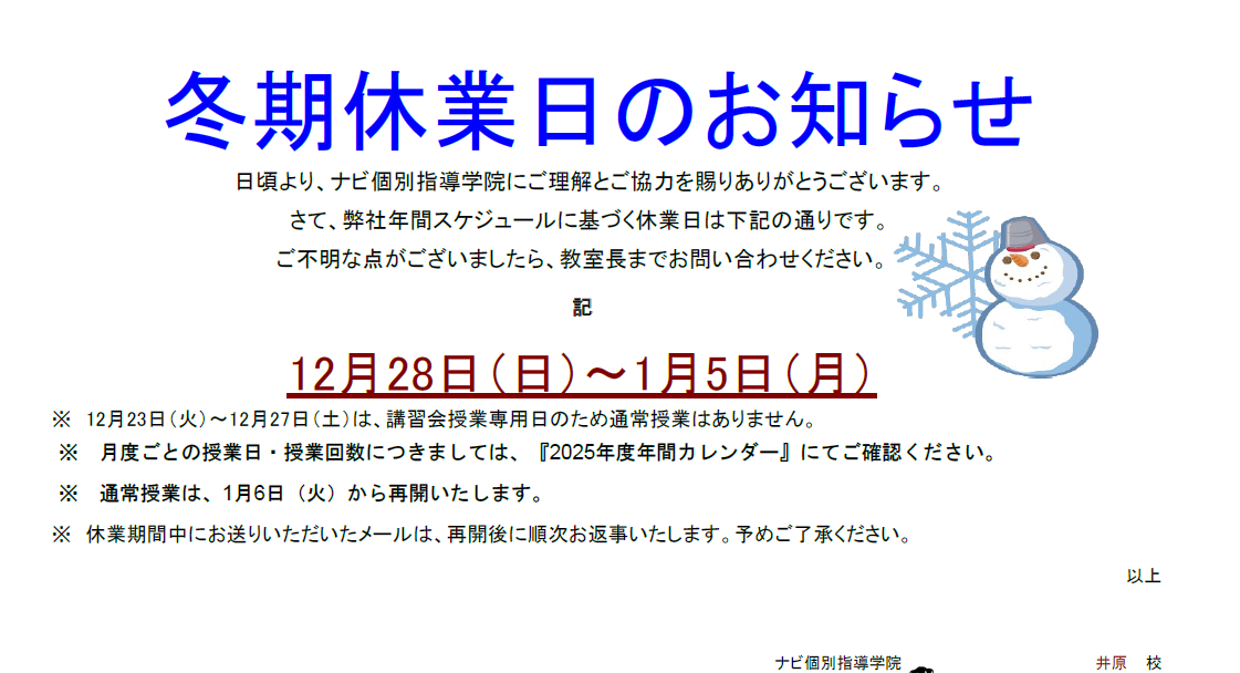 12月28日(日)~1月5日(月)は休校となります。