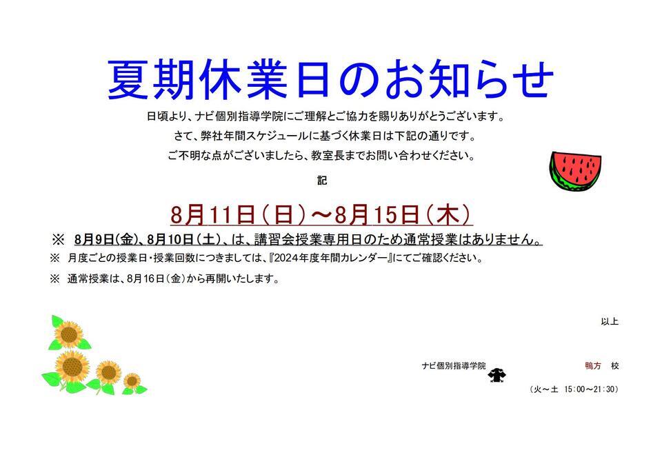8/11(日)~8/15(木)は、夏期休業となっております。