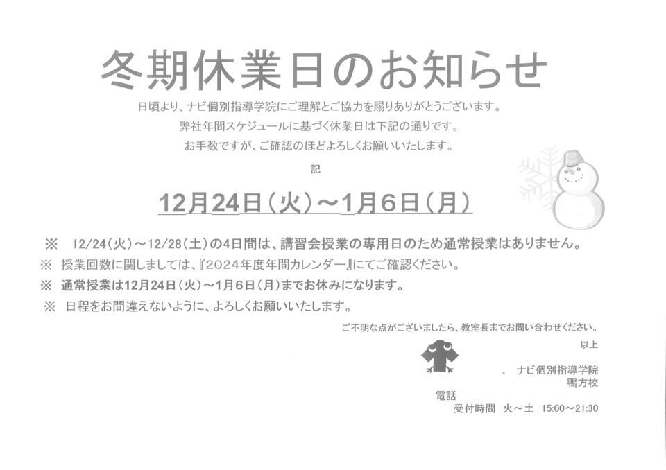 12/24(火)~12/28(土)までは入試対策講習と冬期講習、振替授業を行いますが、