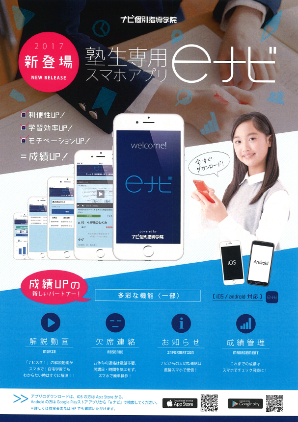 その名も「eナビ」です。 保護者の方、お子様、教室を繋ぐ成績UPと便利さを兼ね揃えたアプリです。