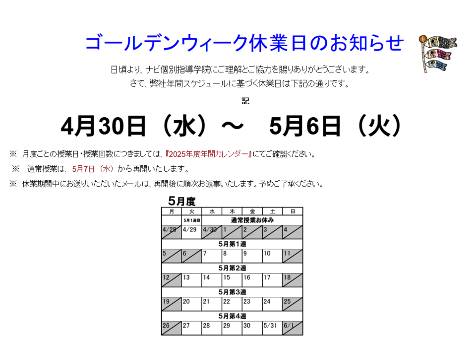 今年は学校のお休みとナビのお休みが違うので気を付けてくださいね