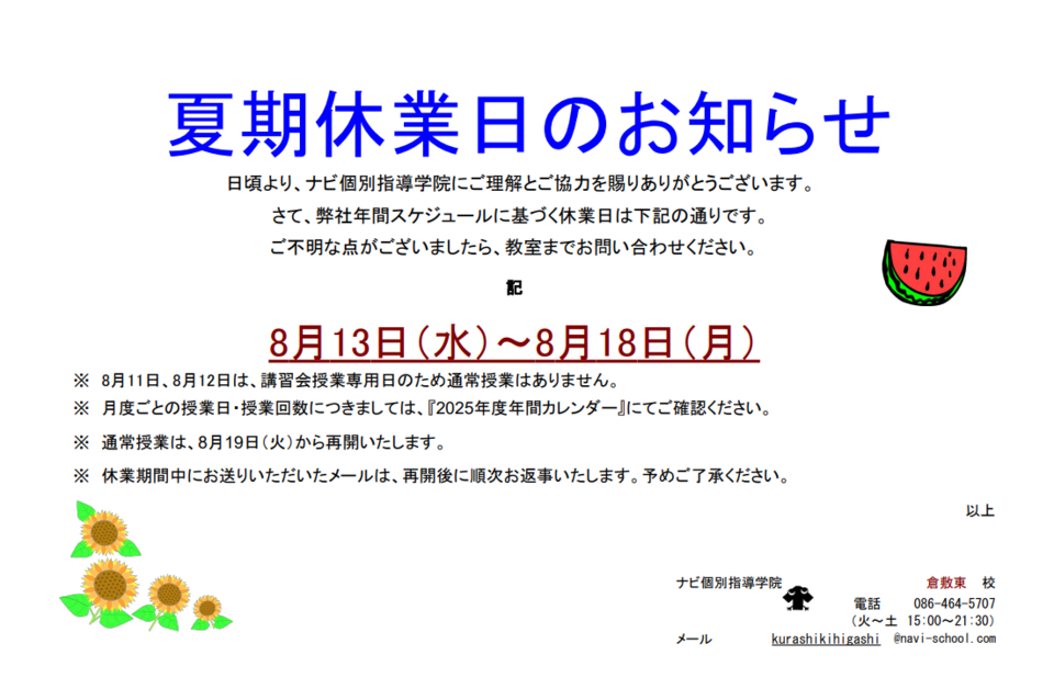 ※8月11日・12日は講習会専用日の為、通常授業はお休みです。